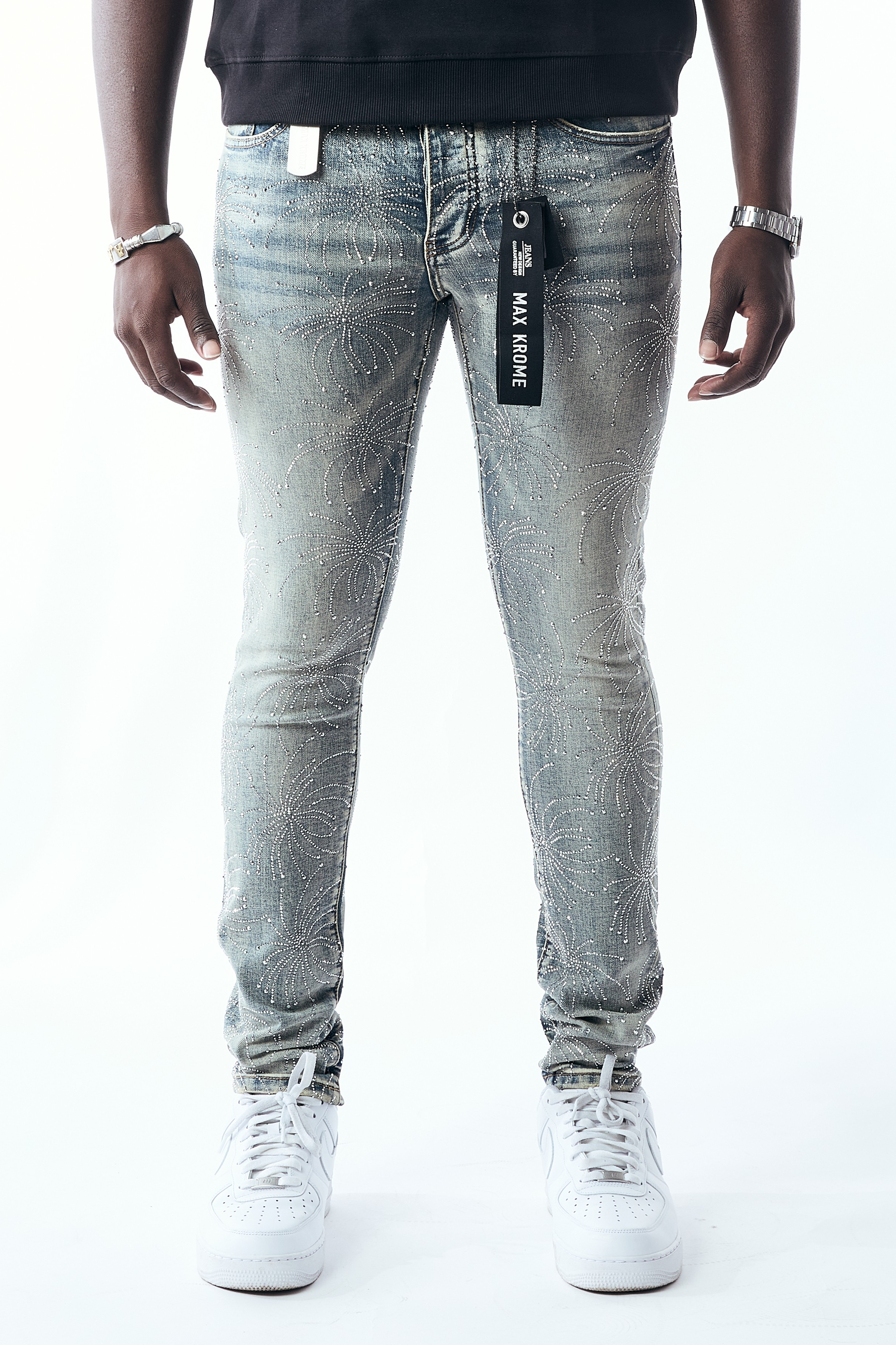 Bring instant spotlight energy to your fit with the MAX KROME 3034 — a skinny-fit denim crafted in a rich medium blue wash and fully embellished with firework-style rhinestones. Designed for those who move with confidence, this pair blends premium fabrication with bold, luminous detailing.
