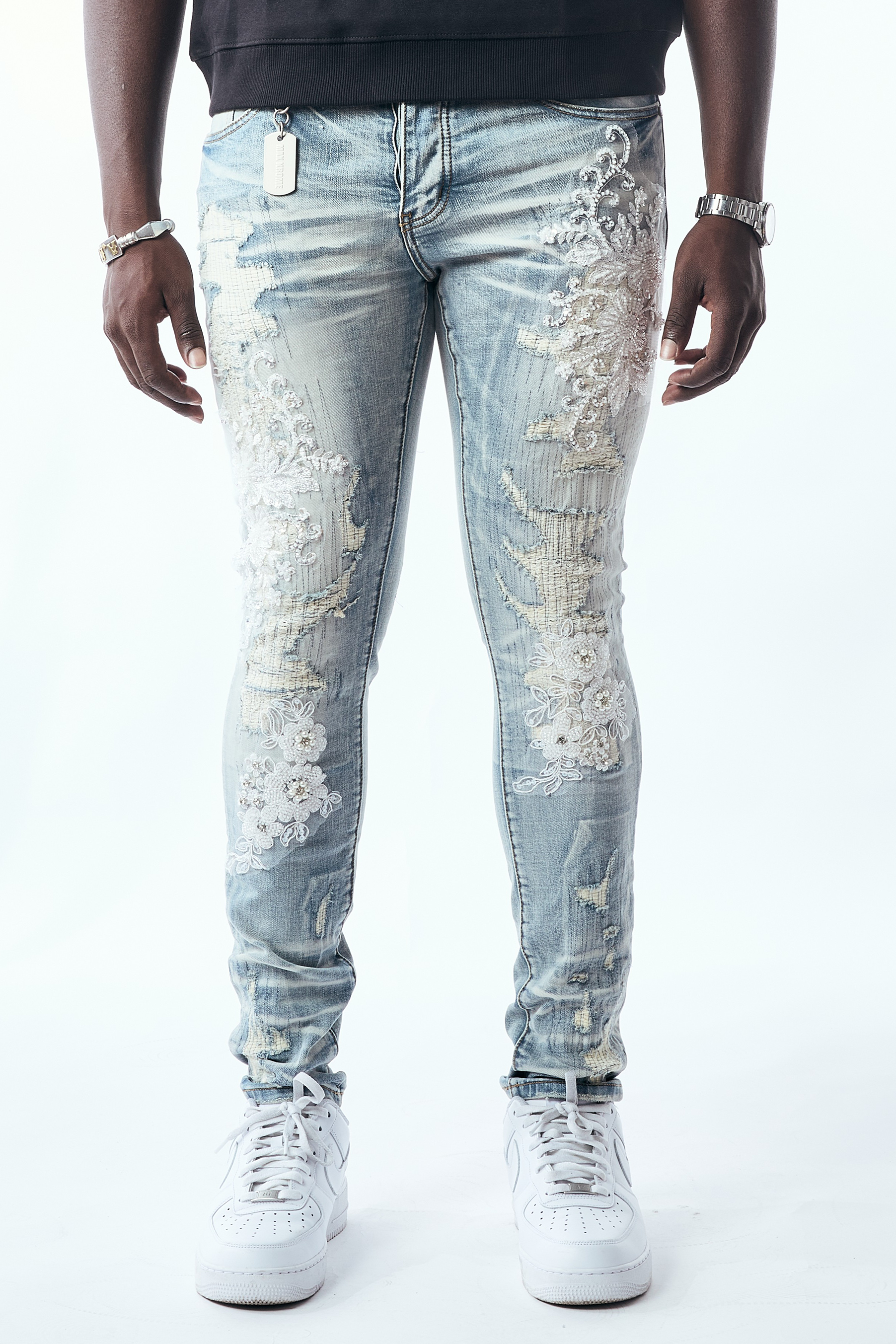 Elevate your look with the MAX KROME 3035 — a skinny-fit denim crafted in a rich Vintage Blue wash and detailed with intricate floral embroidery and rip-and-repair accents. Designed for standout style, this pair blends premium craftsmanship with artistic detailing for a truly elevated streetwear aesthetic.