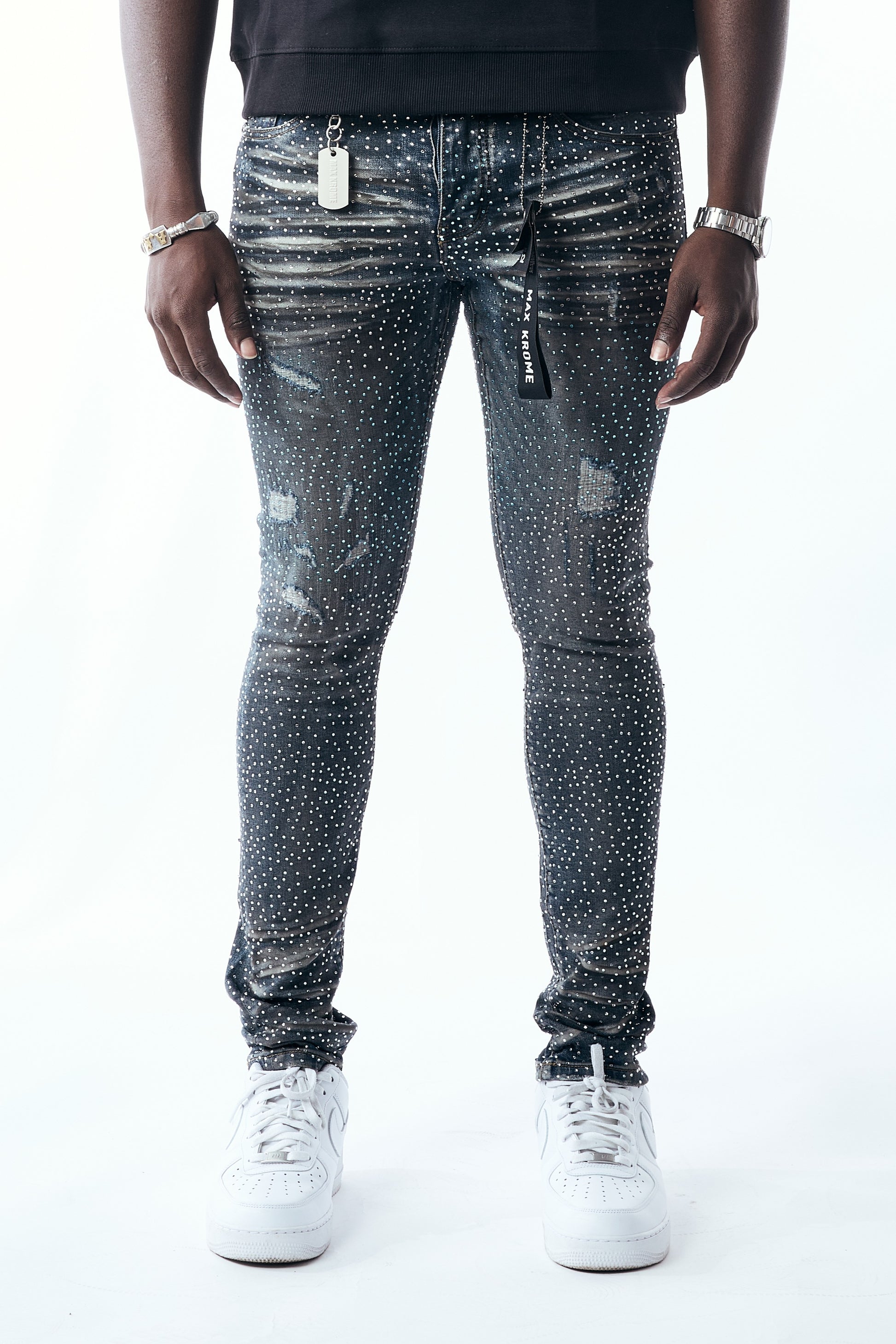 Shine in every step with the Max Krome 3037 — a skinny-fit denim crafted in Dark Blue and Light Blue washes, fully embellished with sparkling rhinestones and finished with premium rip-and-repair details. Designed for maximum streetwear impact, these jeans fuse luxury touches with modern, edgy style.