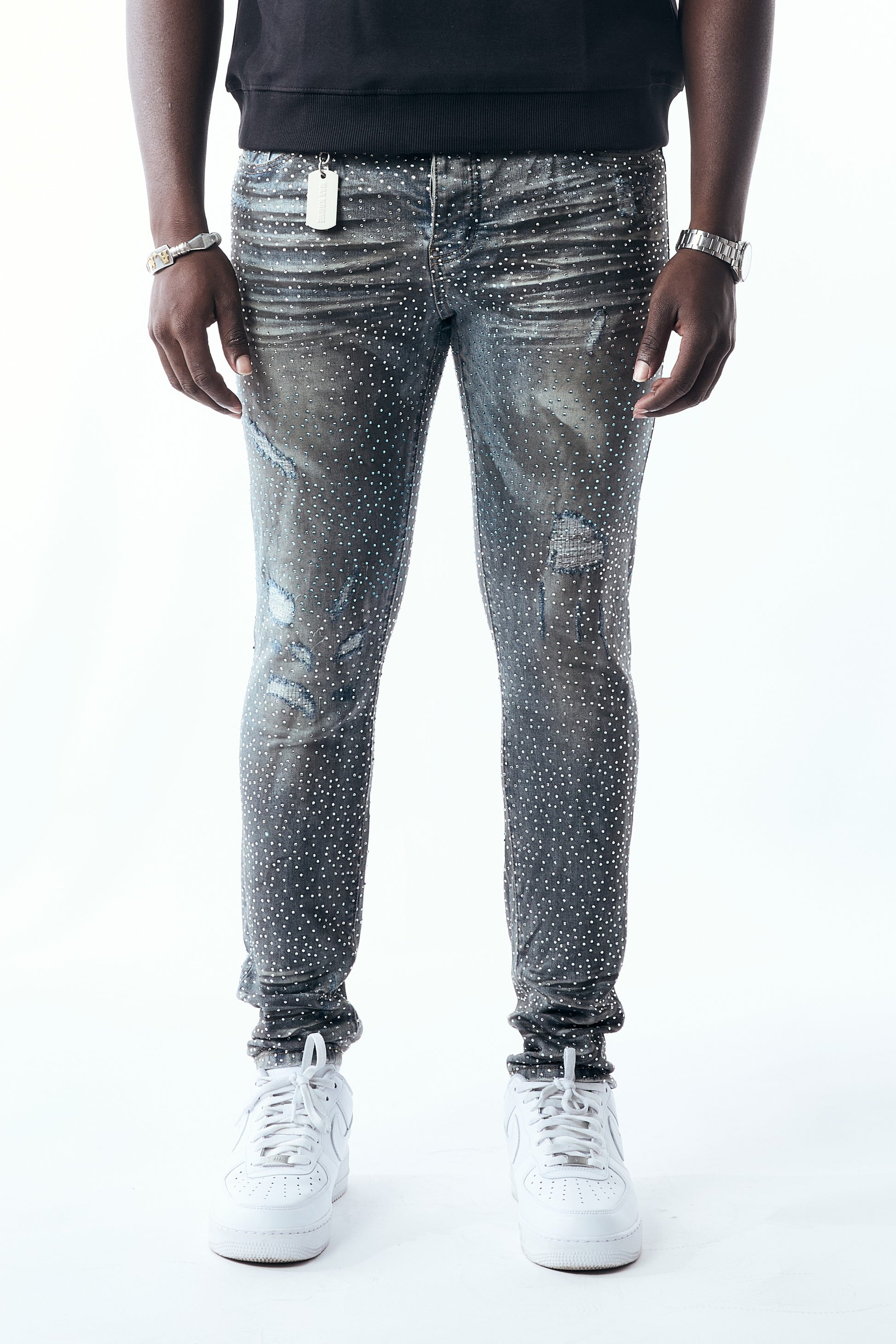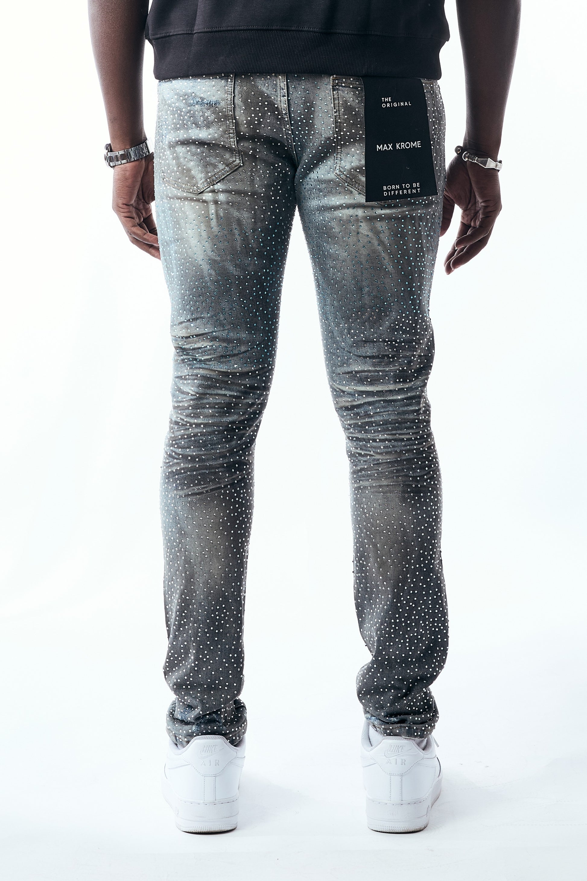 Shine in every step with the Max Krome 3037 — a skinny-fit denim crafted in Dark Blue and Light Blue washes, fully embellished with sparkling rhinestones and finished with premium rip-and-repair details. Designed for maximum streetwear impact, these jeans fuse luxury touches with modern, edgy style.
